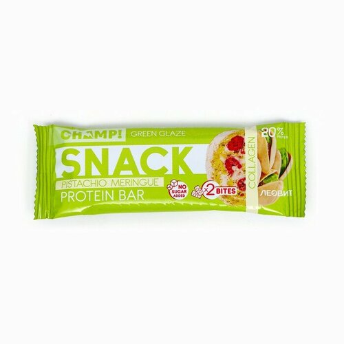 Раздели удовольствие с новым протеиновым батончиком Champ! Snack фисташковая меренга от компании леовит - это два кусочка орехового десерта без сахара, покрытые нежно-зеленой глазурью. В одной упаковке сразу два батончика: всегда можно поделиться одним кусочком или оставить на потом,Восхитительный теплый вкус орехового десерта поднимут вам настроение, а молочный и растительный белки наполнят энергией, и вы надолго забудете о чувстве голода.Батончик Champ! Snack обогащён коллагеном и лецитином. Коллаген — главный компонент, сохраняющий молодость кожи и здоровье суставов, а лецитин обладает антиоксидантными свойствами и помогает обновлять клетки.Батончик Champ! Snack производится без добавления сахара, и не содержит искусственные красители и ароматизаторы.Для удобства в упаковке сразу два батончика. Их можно съесть как за один раз, так и разделить на два. Или же поделиться с другом. Попробуйте другие десертные вкусы линейки — малиновый тарт, кокосовый десерт и абрикосовый пай.