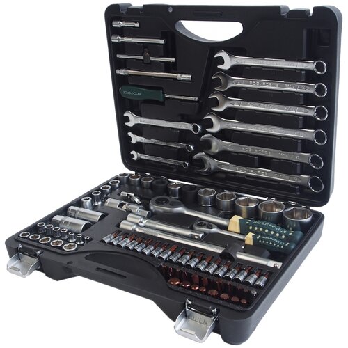 Набор инструментов из 82 предметов и <br /> предназначен для ремонта автомобилей как в <br /> профессиональных сервисных центрах, так и в гараже. <br /> Инструменты изготовлены из качественной <br /> хром-ванадиевой стали и поставляются в удобном <br /> пластиковом кейсе.